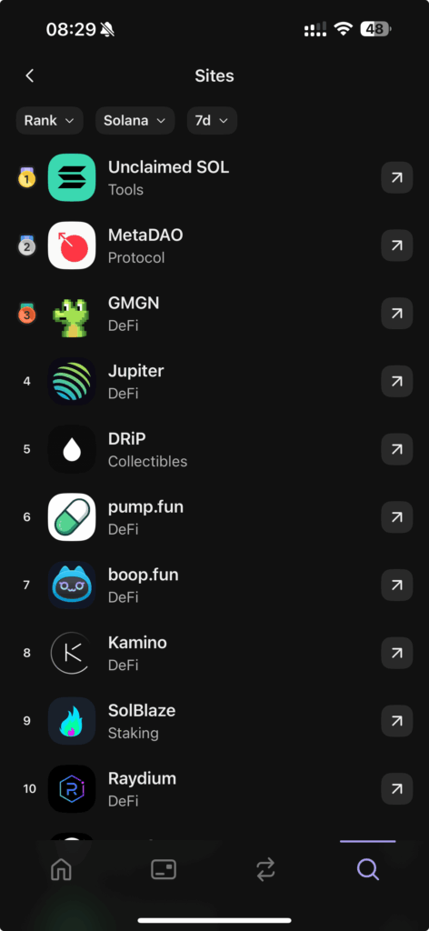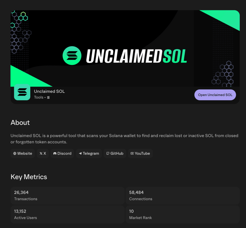 If you navigate to Unclaimed SOL Phantom App Page you can see overall metrics of 25k+ transactions, almost 60k connections and 13k+ active users. This puts Unclaimed SOL in the very top of all Claiming Tools with a market rank of 1.